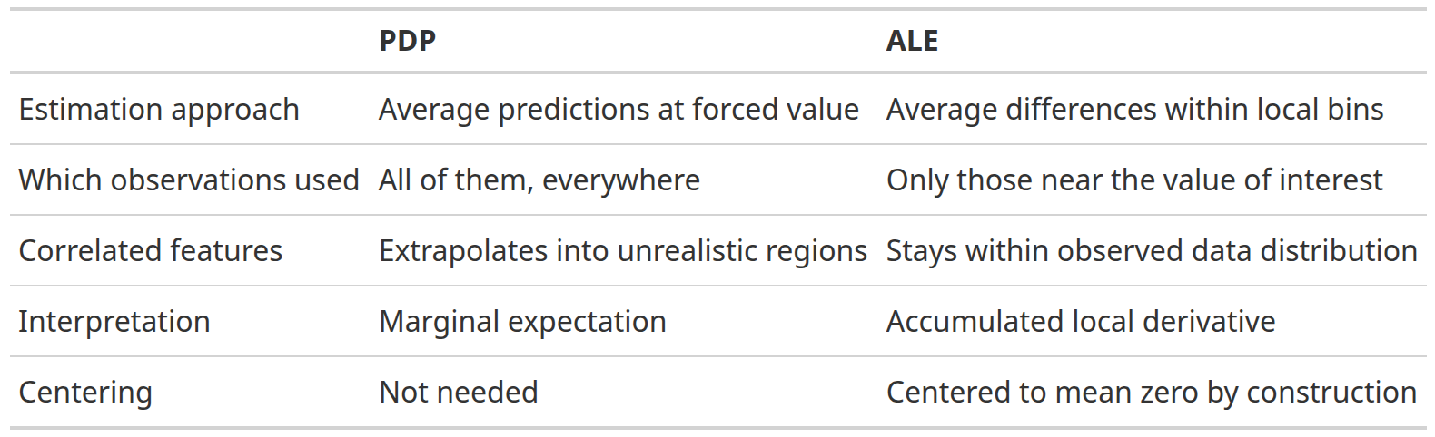 The Intuition ALE plots solve the correlated-feature problem in PDPs by changing what question they ask. Instead of “what happens when I force \(X_s\) to equal \(v\) across all observations?”, ALE asks: “among observations where \(X_s\) is already near \(v\), how does a small change in \(X_s\) affect predictions?”